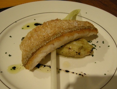 →大根、人参、ぶどうの芽をあしらった皿です。ぶどうの芽は食べられないので飾りだけ。クロケットの中身は丹波黒豆を煮詰めたものが入っていました。少量ながらどれも手間のかかったお料理に感激です。