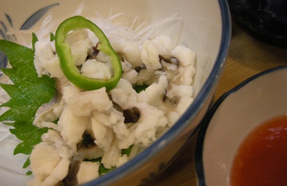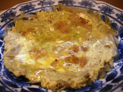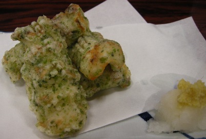 もう1品は「なんこつのたたき」(500円)を予約してありました。これは叩いたナンコツを薄めのハンバーグ形に形成したものを素揚げしたものでした。食べやすいように一口サイズに切り目が入れてあり、少しずつ食べました。その名の通り、コリコリしたナンコツの食感がいいあっさり味の一品でした。