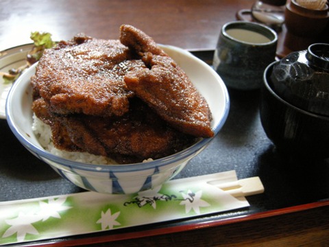 最初に「(大)かつ丼」登場。わお、丼の蓋がカツで押し上げられて浮いている~。これ、埼玉は秩父方面の「わらじかつ」で見た写真に似ている~。カツは薄めで、衣は細かいタイプのものが4枚ぐらい乗っていたと思います。下から順に言うと、丼に白ご飯、それにソースがかかっています。その上に、カツ4枚ですが、それぞれのカツ全体がウスターソース系のサラっとしたソースに浸したものでした。キャベツはなし。丼の蓋にカツ2杯ぐらいを移動させてから食べはじめます。