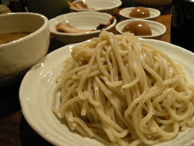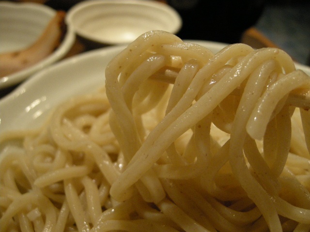 「つけ麺・中盛(300g)」、「胡麻坦々つけ麺・中盛(300g)」共に器は同じ。やや重めの器につけ汁が、同じく重めのお皿に麺がのってきました。麺は太め。生成色~やや蕎麦っぽいぐらいの見た目で、つけ麺に馴染みのない人でも食べやすそうな、うどんと蕎麦好きな人にも抵抗なさそうな色、歯ごたえ、喉越しで気に入りました。