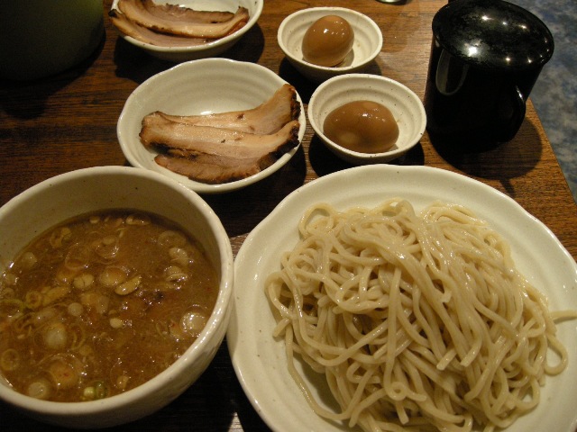 そして、共に、デフォルトで味付け玉子1/2個と、半チャーシュー1枚分ぐらい(?)、穂先メンマ少々が入っていました。味付け玉子の黄身はちょうどいいぐらいの固まり加減&柔らかさを残す感じでなかなか。穂先メンマはアゴが疲れないいい感じの食感。半チャーシューは、キャベツでも添えられていてツマミとして食べるに良さそうなしっかり味でしたが、つけ汁に浸け、箸でほぐれる柔らかさ加減がなかなかよかったです。
