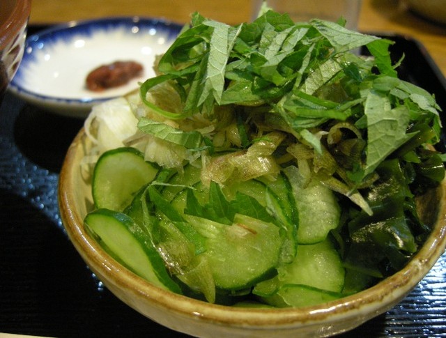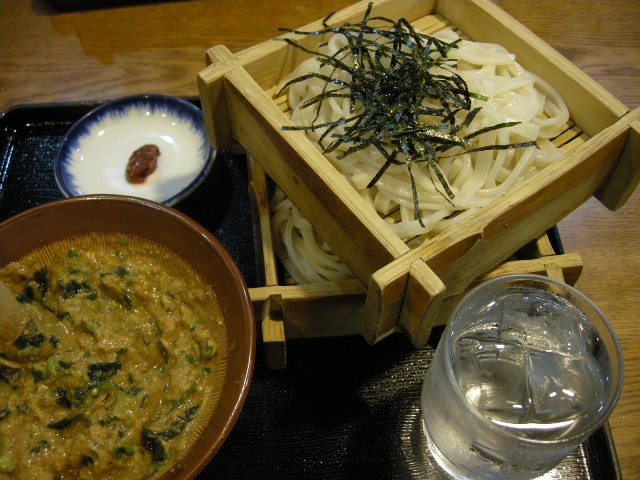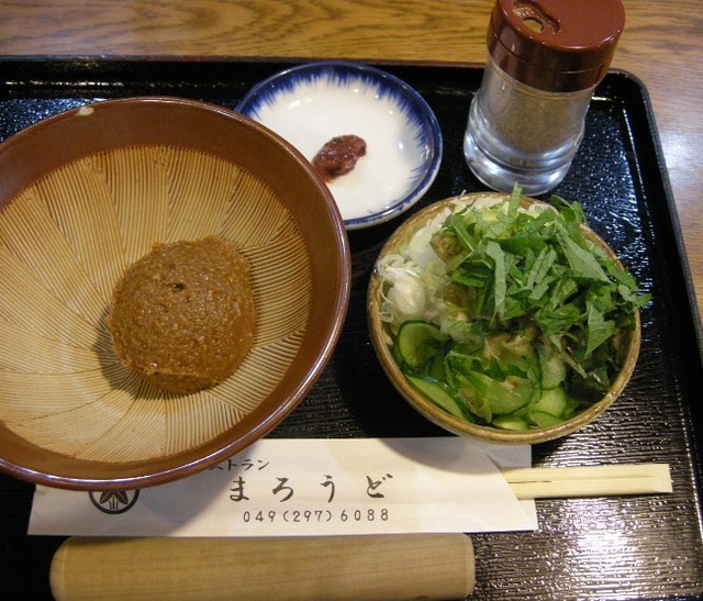 「すったて」は、初めて食べるものなので興味津々です。まずは、味噌の入ったすり鉢と、葱・大葉・きゅうり・みょうがの入った小皿と、氷水の入ったコップと、すり胡麻と梅肉が運ばれてきました。お店の方が食べ方を知っているかどうか尋ねてくれ、知らないと答えると丁寧に教えてくれました。