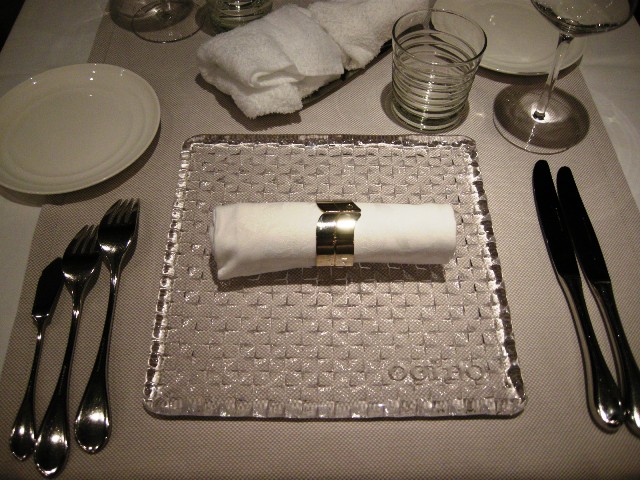 ドアを開けて入るとガラス張りの厨房から満面笑みのスタッフさんとシェフが頭を下げてくれます。案内されたのは手前の中ほど、2人用のテーブルでした。うちの夫は奥の窓に背を向ける方へとっとと入っていくのでちょっと恥ずかしい。一般的には奥がレディーファーストのように思えるのだが・・。でもシェフの手さばきがライブで見られる上座に座れてご満悦だったようなのでまあいいか。