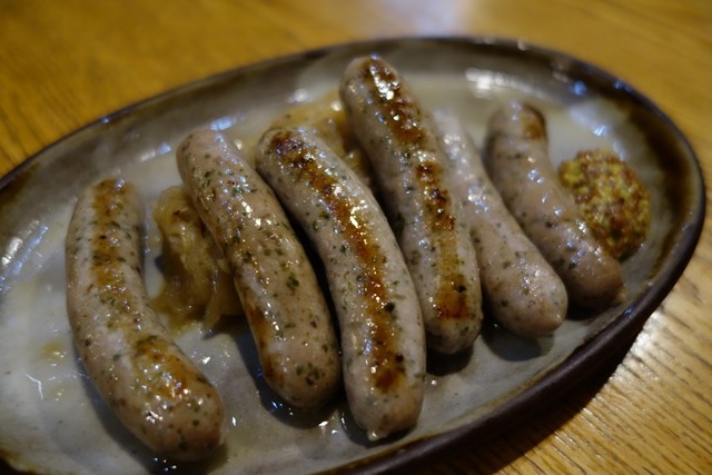 「ニュルンベルガー」はニュルンベルク名物焼きソーセージだそうで、本日のおすすめメユーの中から選びました。本場では炭焼きで供されるのが特徴のようですが、こちらのはそれはなく、焼き色もほどよい感じでした。お皿に添えられていたザウアークラウトの味もとてもよくて、6本で734円とはお値段もお安く感じました。添えられた粒マスタードの香りも気に入りました。