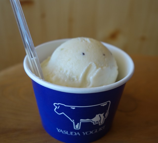 「ソフト・アイスクリームショップ」は自販機で食券を買ってお店の人に券を渡し、好きなフレーバーを伝えて購入する仕組み。店の横に木製の小さな腰かけがあるので、そこに腰かけて頂きました。