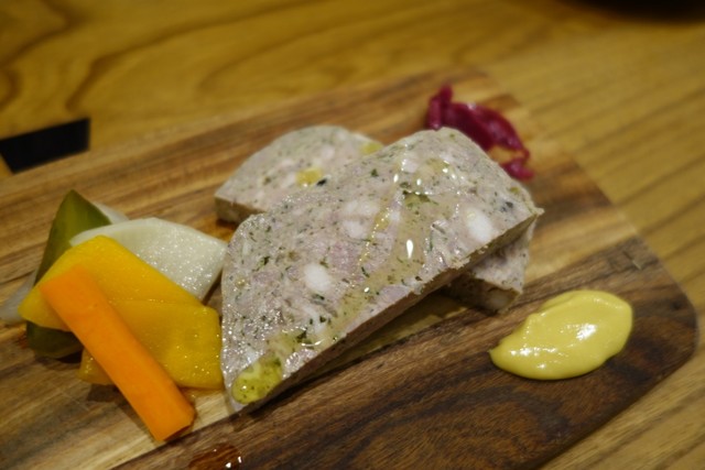ここでドリンクは、私は「泡」を、同行者は「白ワイン」を選びました。おつまみは「豚のリエット」と「パテドカンパーニュハーフ」を選択。「豚のリエット」には薄切りのパンが別料金じゃなくてちゃんと添えられているし、「パテドカンパーニュハーフ」には自家製ピクルスが彩良く添えられていて、味の良さだけでなく見た目やCPの良さも大満足。