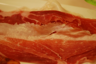 「イベリコ・デ・ベジョータ」(ハブーゴ産ベジョータの24ヶ月)。公式サイトによると「1月10日(土)現在カットしている固体、超絶濃厚です!このメーカーのこの熟成度からするとここが天井ではないでしょうか。ただこのぐらいのレベルは毎回続きません。ベジョータもイタリア・プロシュット同様、固体差や切る位置、保管状況によりがもにすごく差が出ます。」とのこと。