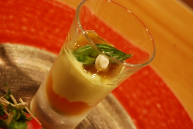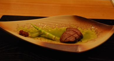 ・しきんぼとクリームチーズのスプリングロールとグリーンアスパラガスのブルーテコンソメジュレ添