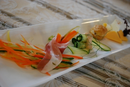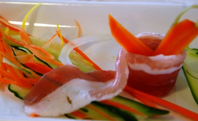 (前菜アップ)プロシュートで巻いてあるのは人参のピクルス