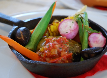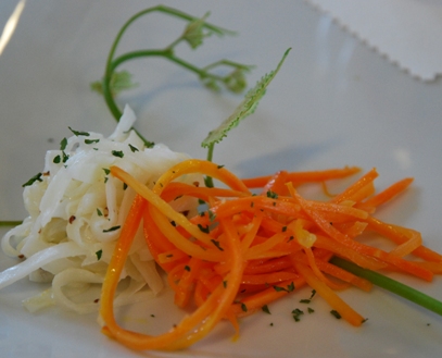 →大根、人参、ぶどうの芽をあしらった皿です。ぶどうの芽は食べられないので飾りだけ。クロケットの中身は丹波黒豆を煮詰めたものが入っていました。少量ながらどれも手間のかかったお料理に感激です。