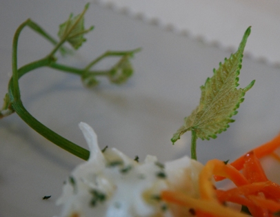 (魚料理アップ)ぶどうの芽は食べられないので飾りだけ。カエルの手みたい。