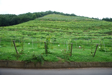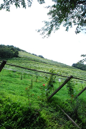 ぶどう畑の手前にバラが植えてあります。バラが元気なら同じバラ科の葡萄も安泰らしい。