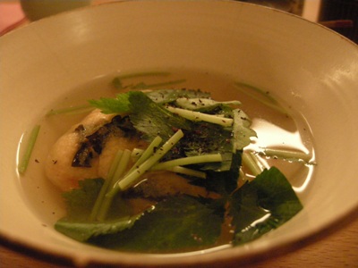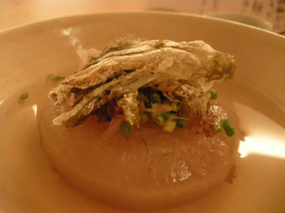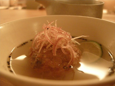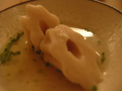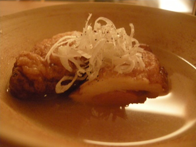 「大根」:完璧に面取りしてある!大根の上に、とろろ(おぼろ)昆布とあさつきが上に飾られています。あっさりした出汁。こちらのお出汁は色も薄く繊細。鰹風味をトップに感じる気がしましたがどうでしょうか。関西のお出汁は昆布が強く出るところが多いので、その点では、見た目の薄さは関西、鰹出汁は関東という具合に関西と関東の融合のような気がして好感度大。