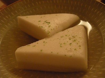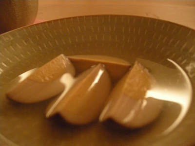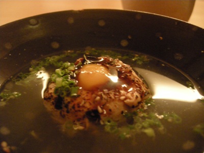 「玉子」:福島のなんとかファームのものだそうで、料理長が色んな高いものからリーズナブルなものまで食べ比べて決めたものだそう。縦に4つ切りにしてありました。大げさだけど、表面に出汁色が染み込んでピータンみたいなんて思いました。いえ、ピータンといえども黄身は普通の黄色ですけどね。