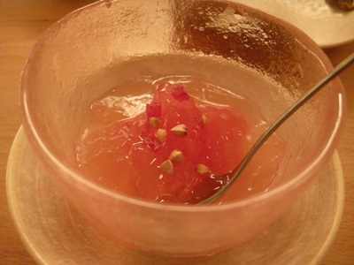 「スイカゼリー」:甘さ控えめシロップ漬けのスイカに、柔らかめのスイカ果汁ゼリー、そして蕎麦の実とほんの小さい三角の赤い飴をトッピングしたもの。赤い飴もひょっとして自家製のスイカ飴だったのかな?この飴のアクセント、めちゃ旨でした。