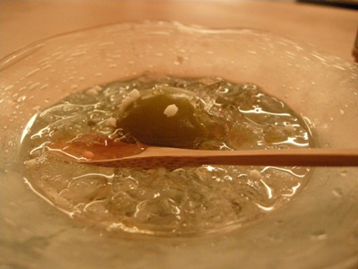 「青梅煮」:これも限定品だそうで、頼んでしまいました。デザートは、当日はスイカと青梅の2種類でした。肉厚な青梅の上にクラッシュアイス、そしてシロップをかけたようなもの。溶けたクラッシュアイスとシロップのハーモニーも素晴らしく全部飲み干してしまいました。