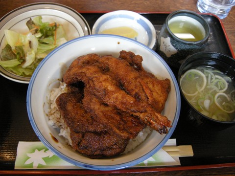 最初に「(大)かつ丼」登場。わお、丼の蓋がカツで押し上げられて浮いている~。これ、埼玉は秩父方面の「わらじかつ」で見た写真に似ている~。カツは薄めで、衣は細かいタイプのものが4枚ぐらい乗っていたと思います。下から順に言うと、丼に白ご飯、それにソースがかかっています。その上に、カツ4枚ですが、それぞれのカツ全体がウスターソース系のサラっとしたソースに浸したものでした。キャベツはなし。丼の蓋にカツ2杯ぐらいを移動させてから食べはじめます。