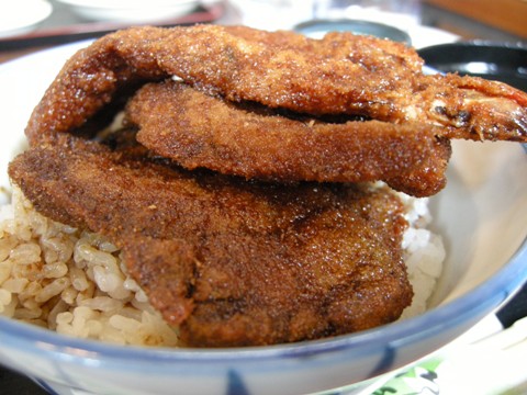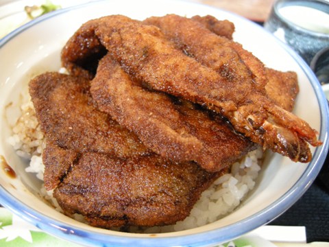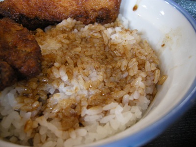 私たちはお代わりはしませんでしたが、ご飯にソースがかかっている部分を食べてみたところ、少し酸味のあるソースらしい味がしていました。が、カツにしみこんでいるソースは酸味がなく、まろやかで甘い味になっていました。想像ですが、カツのソースは、大阪でいうところの「二度浸け禁止」なソースと同じく、油で揚げたものを何度も浸けるから油の作用でまろやかになっているのではないかと。このソースと一体になったカツの味は絶妙で大いに気に入りました~。
