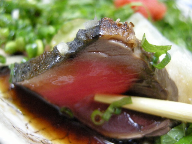 →ニンニクは摩り下ろしorスライスを選べ、スライスを選択。脂はあまりのっていないものだったからか、薄めに切ってありました。カツオの上には青葉、生姜、あさつき、みょうが、ごく薄い玉ねぎ、もみじおろしがのっていて、底にはポン酢がたっぷり。脂ののった分厚いタタキも好きだけど、これもとても美味しくいただきました。