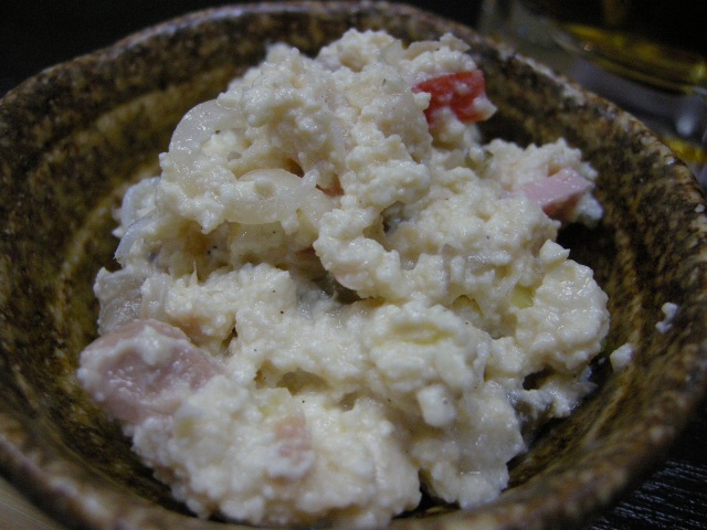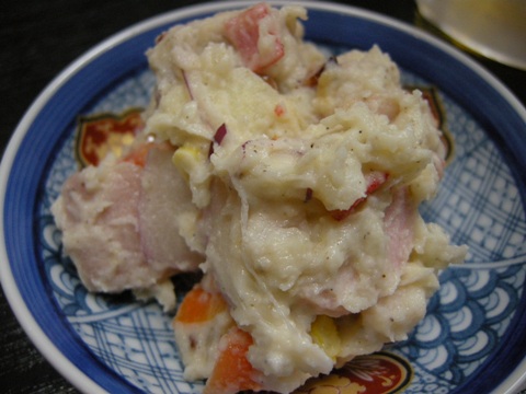 生ビールで乾杯。お通しはポテトサラダでした。ウインナーがたっぷり入っていて私は美味しくいただいたけど、リンゴがポテサラに入っているのが苦手な人のところにたっぷり入っていたのが皮肉でした。