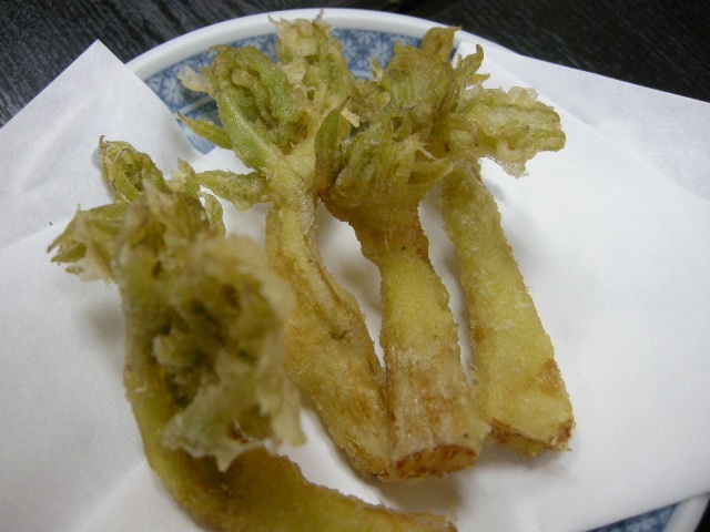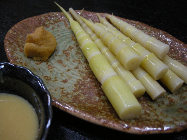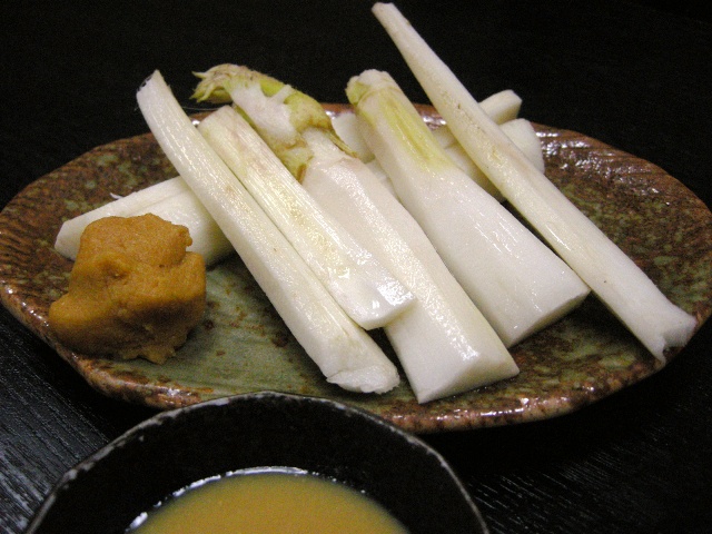 →天ぷらor茹でが選べ、茹でを選択。味噌か酢味噌を付けて食べます。シャク、っとした食感がいい感じ。齧ると節の部分でコロっと折れる感じも面白い。