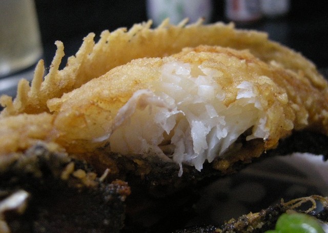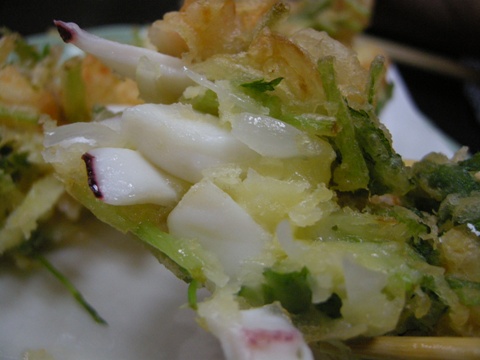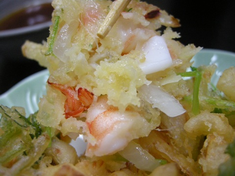 →塩と天つゆ両方用意してくれました。かき揚げは三つ葉が色も味もポイントに♪天つゆは色は濃いがしょっぱすぎず、美味しく、全部飲み干してしまった。塩も細かいもので美味しかったです。