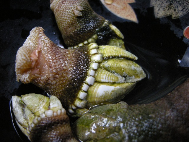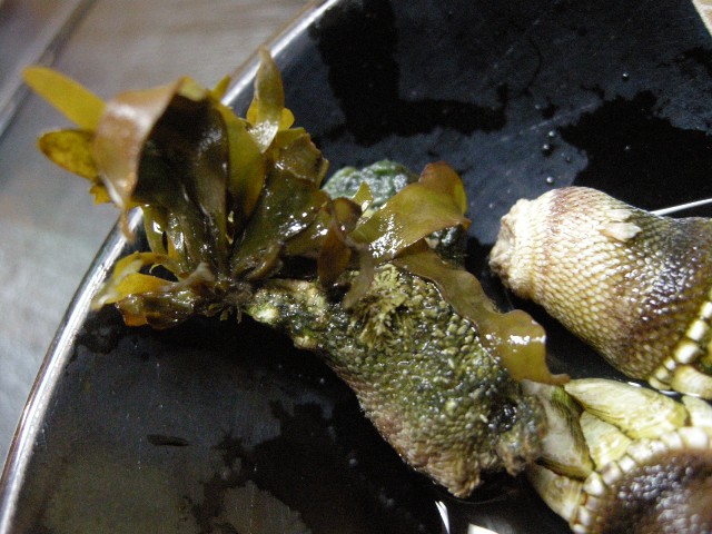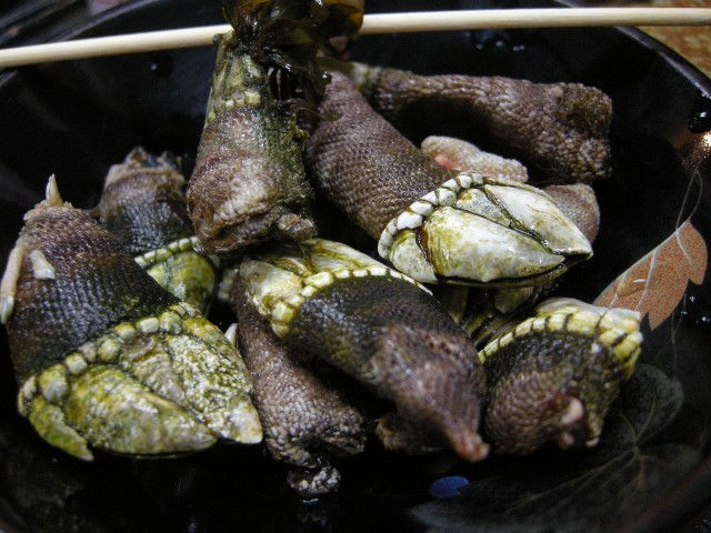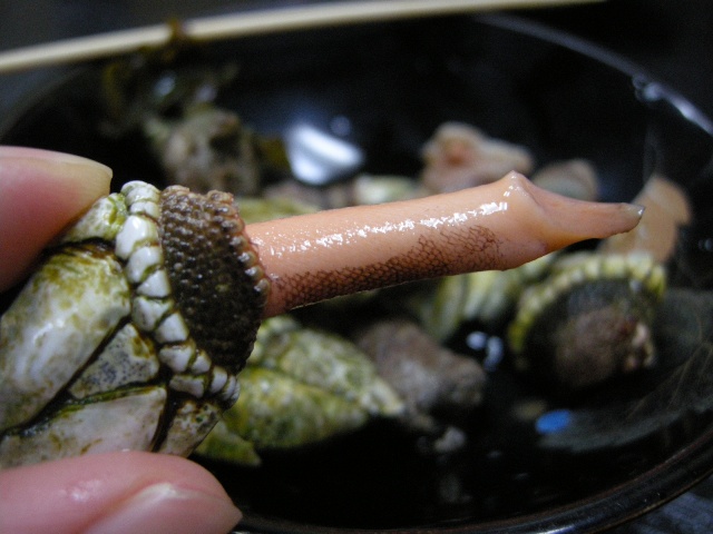 さて、そろそろお暇を。。というところで、厨房からご主人が出てきてご挨拶してくださいました。「インターネットで見て志木から来ました」ってお話したら、「おお、そんな遠いところから!?」と。(笑) ちょっと珍しいものがあるからサービスでお出汁しましょうと出てきたのが塩茹された「亀の手」。いやあ、すごいなあ。グロテスク。夫も私もどこかで食べたことがあるのだけど、思い出せない。皮を剥いて亀の腕にあたる部分を食べます。貝のような食感ですが、海老や蟹、フジツボなどと同じ甲殻類なのだそうで、海老っぽい味もするかな?春~初夏が旬の珍味だそう。貴重なものをありがとうございました。