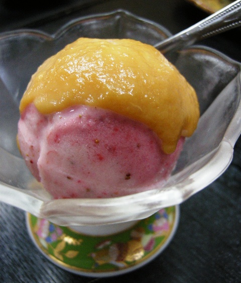 そうこうしているときに、やっぱり気になる「自家製苺アイス」を注文しちゃいました。やや、なにやらアイスの上に茶色いものが!!お聞きしたら「生キャラメルソース」がけだそう。アイスも生キャラメルも、甘さ控えめ、めっちゃ自家製感のある優しい味と食感でした。