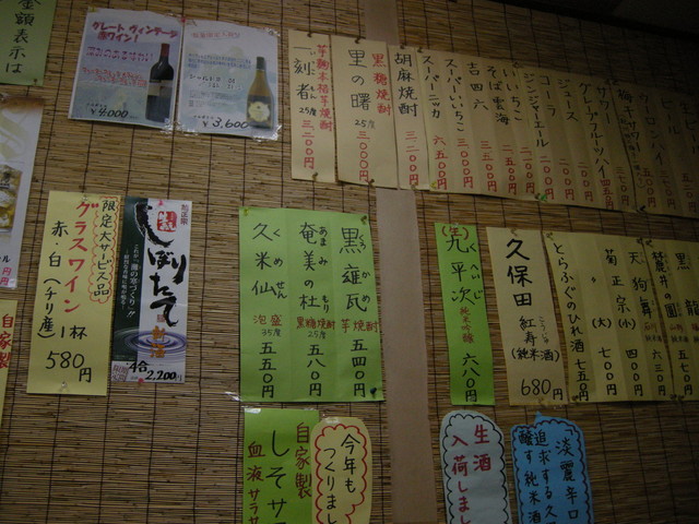 店内は、左にカウンター席、右側に掘り炬燵式小上がり席4人用×3卓、奥の左が厨房、という造りでした。カウンターといっても、カウンター割烹やお寿司屋とは違い、現在はその中で調理が行われるということではなく、なぜその造りなのかはよくわかりません。(笑)私たちは掘り炬燵席へどうぞ、と言っていただき着席。メニューは定番系が短冊に書かれて壁に貼られ、本日や季節のオススメ品はホワイトボードに書かれて壁にかけられています。その文字が全て手書きなのですが、手書きのゴシック体のような、やや四角い字体で丁寧に書かれているもので、こちらのお店の方のお人柄が想像できそうで好感が持てました。