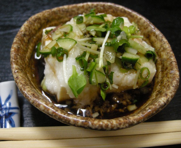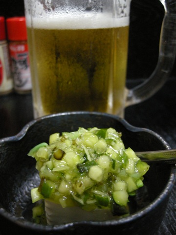 まずは生ビール(570円)×2でカンパイ。この日のお通しは、豆腐の山掛けでした。やとろろの上にキュウリを細かく刻んだものが少量あしらわれているのが、さっぱりとした食感を引き出していていい感じです。
