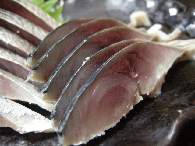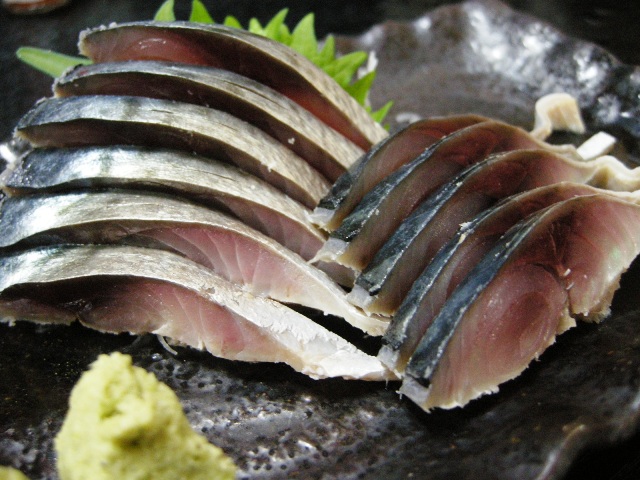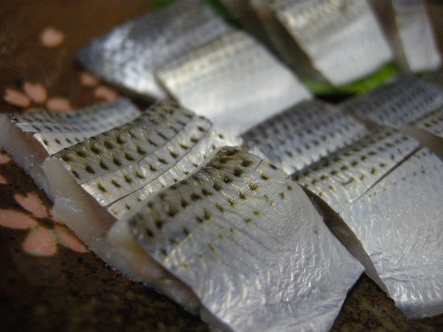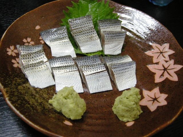 →生で食べられるのではないかと思われる鮮度の良さに思えました。身は酢で白くなった部分よりも赤身の残った状態で、大喜びのあまり、箸を口に運ぶ手が止まりませんでした。わさびがたっぷり添えられていましたので、惜しげもなくつけて頂きました。