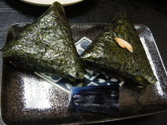 →前回訪問時に隣のお客さんがお握りを注文していらしたのを聞いていて、メニューにはないのですが、できるか尋ねてみました。もしかしたら、混雑時は作れないからメニューにないのかもしれません。今回は作っていただけるとのことで、味は3種。鮭、昆布佃煮、梅干があるとのこと。私たちは鮭と昆布佃煮を1つずつ注文。どちらも具がご飯と混ぜてあり、その上から海苔が巻かれたオリジナリティのあるおにぎりでした。