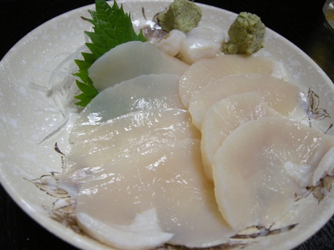 →大きな貝だそうで、一切れの直径も大きい。薄切りしてあり、わさびと醤油をつけていただきます。鮮度の良さを特に感じ、貝はものによってはあまり得意でない私が貝好きになりそうなびっくりの美味しさでした。