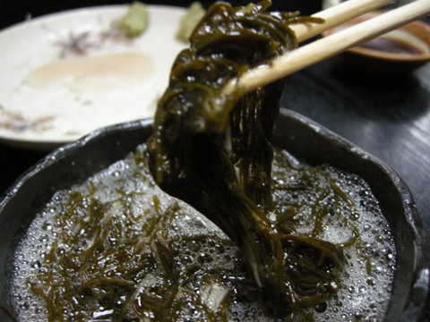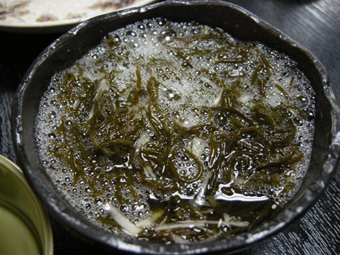 →一般的に知っていたもずくよりも弾力性があり、色も黒くて食べ応えのあるものでした。ごく細かく刻んだ生姜を和えてあったような気がします。