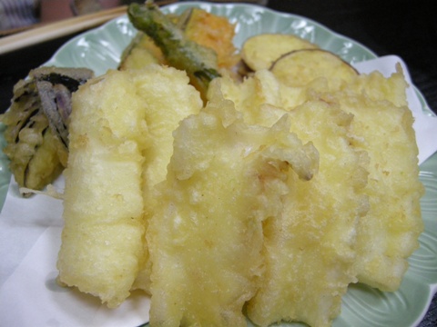 →家で年に1~2度買ってキンピラなどにして食べる「うど」といえば、ひょろっとしていて、ちょっとスカスカした感じのするものでしたが、「山うど」はなんだか別物に見えました。これはずっしりと重みがあり、しっとりしていて、大根と蕪を足して2で割ったような味と食感。芥子味噌と味噌をつけてくれていて、交互につけて食べました。根本は生で食べるものなのですね!穂先は天ぷらにして持ってきてくれました。感激~。「山うど」、初めて食べられて嬉しかったです。