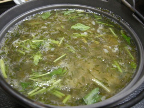 →もずくが雑炊って一体!?な興味も手伝って、暑い夏ながら注文してみることに。鍋焼きうどんなどによく使う一人前の鉄鍋に入ってきました。トップには三つ葉があしらわれ、具には椎茸やシメジなどの茸類が。鰹出汁がまたいい味で。きのこの成分なのか、ややとろみもあって、とっても美味しかったです。これは飲んだ〆にもピッタリですね~。