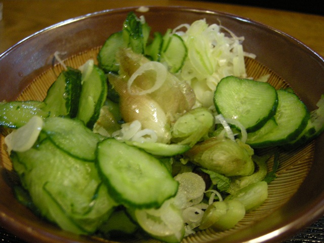 「すったて」は、初めて食べるものなので興味津々です。まずは、味噌の入ったすり鉢と、葱・大葉・きゅうり・みょうがの入った小皿と、氷水の入ったコップと、すり胡麻と梅肉が運ばれてきました。お店の方が食べ方を知っているかどうか尋ねてくれ、知らないと答えると丁寧に教えてくれました。