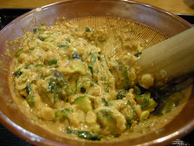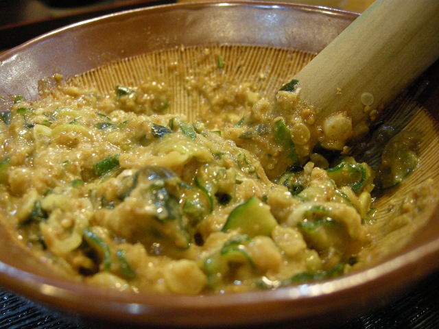 ・氷水を少しずつ擦り鉢に入れてつけ汁として食べるのに適当な濃さに薄める。