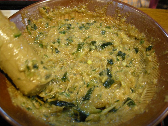 ・味噌入りの擦り鉢に薬味類を全て入れ、すりこぎでよく磨り潰す。