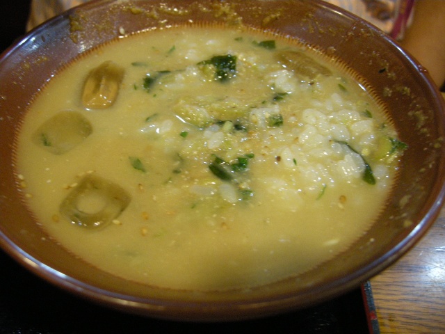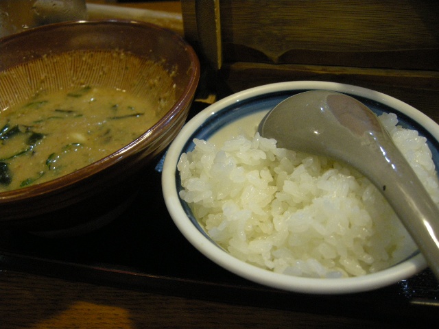 「うどんを食べ終わってまだお腹に余裕があれば、白ごはんをサービスしますので声をかけてください」と言ってくださっていましたので、2人ともご飯をもらってみました。温かいご飯です。ついてくるレンゲにご飯をのせてつけ汁に浸け、瞬時に口に運ぶとこりゃまためちゃうま~。温かいご飯と冷たい汁のコントラストが特に気に入りました。ひょっとしたら、うどんよりもご飯で食べたほうが好きかも~。美味しかったなあ。