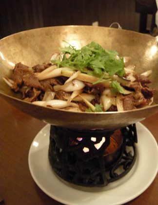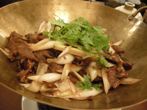 アルコールランプなのか、火の上にのせてくれます。白葱と椎茸と羊肉を炒めたものに、香草がたっぷりのっているようなお料理でした。