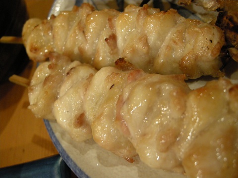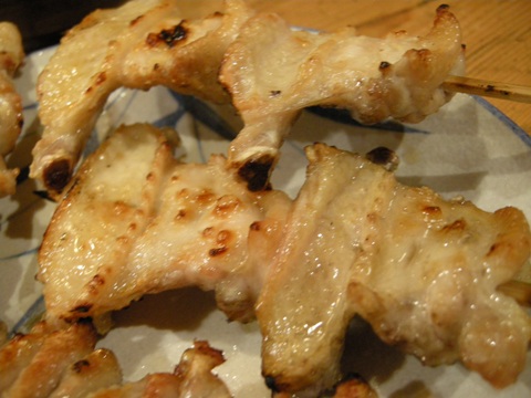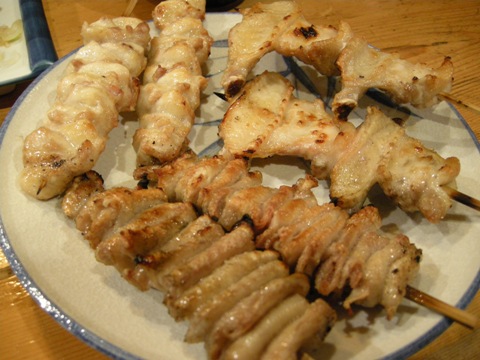 2本ずつ注文しました。1本が大きいです。手羽先は普段面倒だから滅多に食べないのですが、ここのは評判がいいらしく注文してみたら、これが美味しいのなんの。鳥の味がいいんだろうなあ。感激。ひな皮とぼんじりは薄めの味付けで、どちらも私にとってはちょっと油っこいかなあと思いました。