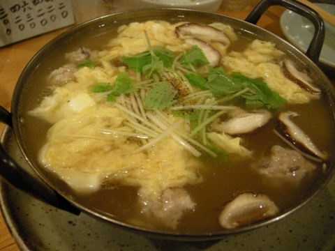 うずらの半熟玉子、つくね、椎茸、三つ葉が入っていました。いい香りで澄み渡った美味しさです。これは絶品。ランチでもスープ自体は出るそうなのですが、そのときは具がないんだとか。夜のこの「鳥スープ」は絶対オススメ。