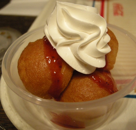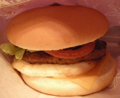 →フライドエッグ(目玉焼き)とデミグラスソースのチーズバーガーです。デミグラスソースが入るからか、結構べちゃっとしていました。味は悪くなかったです。セットには、フレンチフライポテト、ソフトドリンク(ホットコーヒーを選択)、カスタードクリームボールがついていました。カスタードクリームボールというのは、丸いドーナツみたいなものの上にホイップクリームがのったデザートでした。