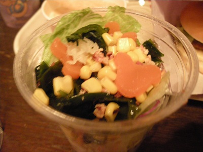 →カップに入ったサラダです。ミッキーの型にくり抜いたオレンジ色のものが3枚ぐらい入っていて、それは人参じゃなくて、寒天っぽいというか、なんかそういうクニャっとした食感のものでした。