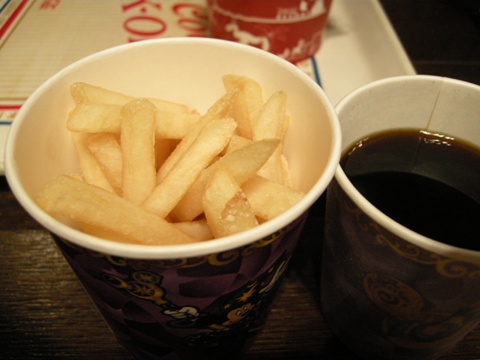 パーク内で「アイスティー」を初めて飲みましたが、結構美味しく思いました。ミッキー型のチキンナゲットにも合いますね♪こちらのポテトは塩控え目、お好みでケチャップタイプ。