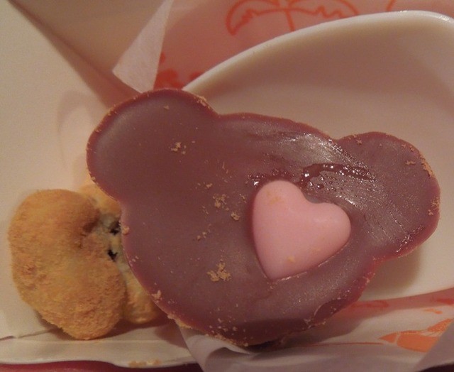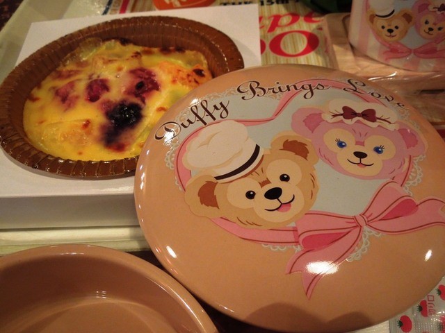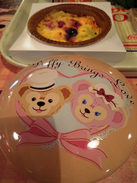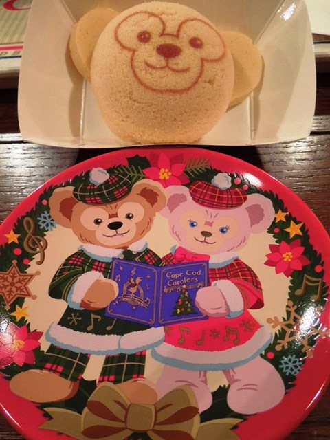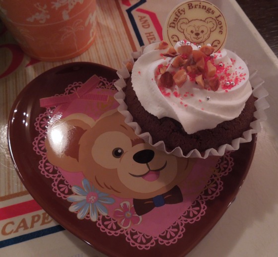 「スーベニールプレート付きのクリームチーズ入りブラウニー」はメニュー写真ではまだドーナツだったのですが、売り切れてしまっていたそうで(HPからは消えていましたが)、他の店でも売っている「クリームチーズ入りブラウニー」であったのは少々残念。というか、どうしても食べたかったらもっと早く来ていたので、別にいいのですが。プレートはダッフィーとシェリーメイがあり、ダッフィーを選択。ハート型の陶器製で可愛いけど何に使うか悩みます。