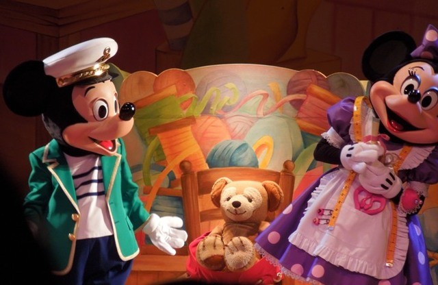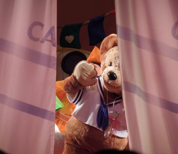 ミニショー「マイフレンドダッフィー」の1話ダッフィーの誕生が公演終了となり、代わりに3話のシェリーメイ誕生ストーリーが始まったので、それ目当てで右側のショー&食事エリアへ。午前中は混むとの知人の話を聞いて、15時頃に訪問。30分ぐらい並んで入れました。