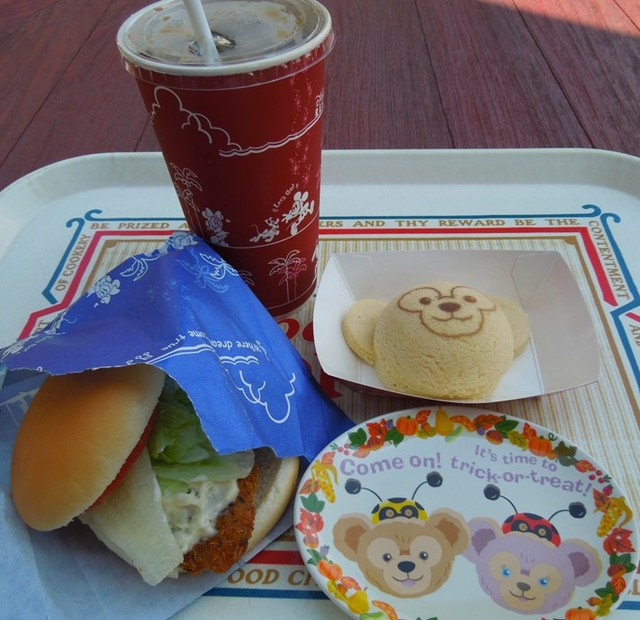 2人で訪問し「ハンバーガー」(310円)、「コッドフィッシュバーガー」(370円)、そしてこちらも迷った結果やっぱり欲しくて「ダッフィーのスーベニアプレート付きカスタードケーキ」(800円)を。
