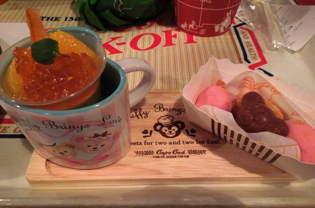 「オレンジムースデザートとアソーテッドチョコレート スーベニアカップ&トレー付」は、オレンジムースデザートトップについているオレンジピールが本格的で気に入りました。アソーテッドチョコレートはダッフィーの顔型チョコレートを中心に、チョコでコーティングされたドライ苺とか、サクっとした食感のお菓子などが盛り合わせ。木製のトレーはかなり細くて小さいので、家では食卓の七味唐辛子などをのせるトレーにしました。ハート型のカップも間違いなく可愛いのですが、ミニサイズなのでコーヒーなどを飲むには小さいなあと。何に使いましょうかね~?